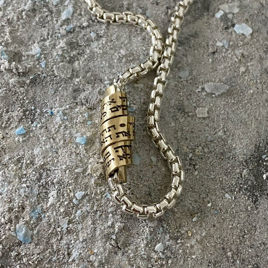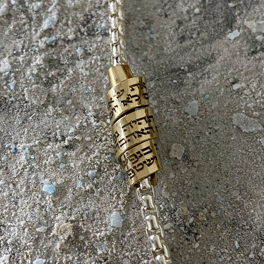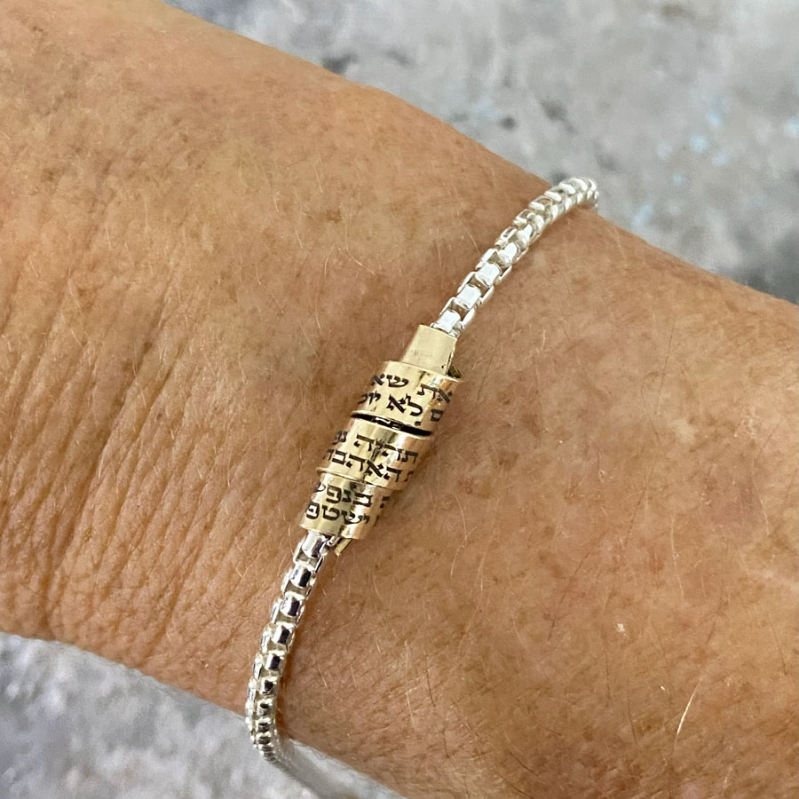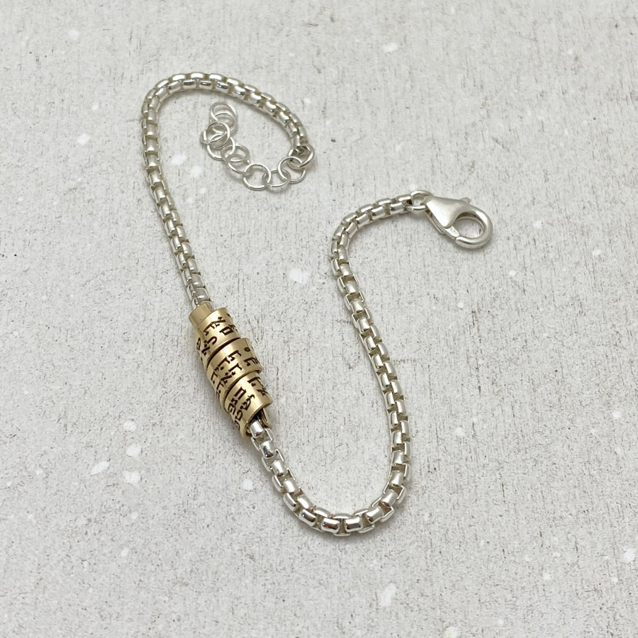 This elegant silver bracelet with a gold-filled pendant features Hebrew verses of love from the Song of Songs.