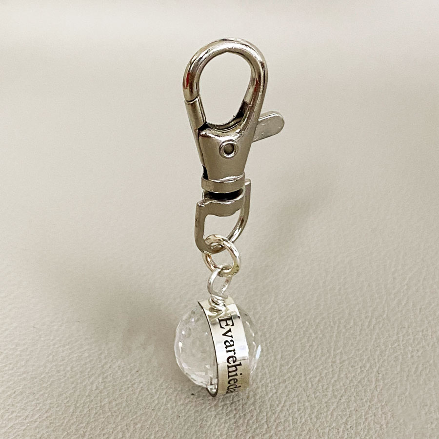 This sterling silver crystal quartz faceted ball keychain is perfect for a personalized message.