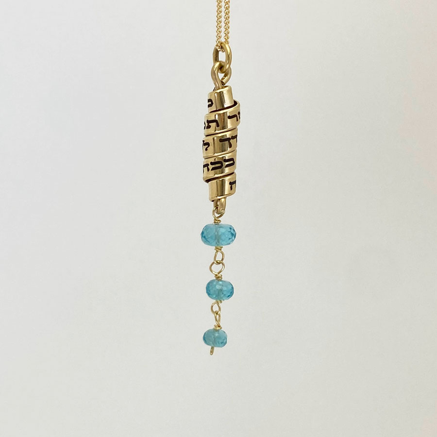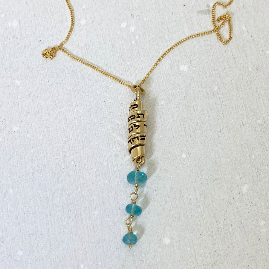 Apatite gemstone necklace engraved with the Hebrew verse: