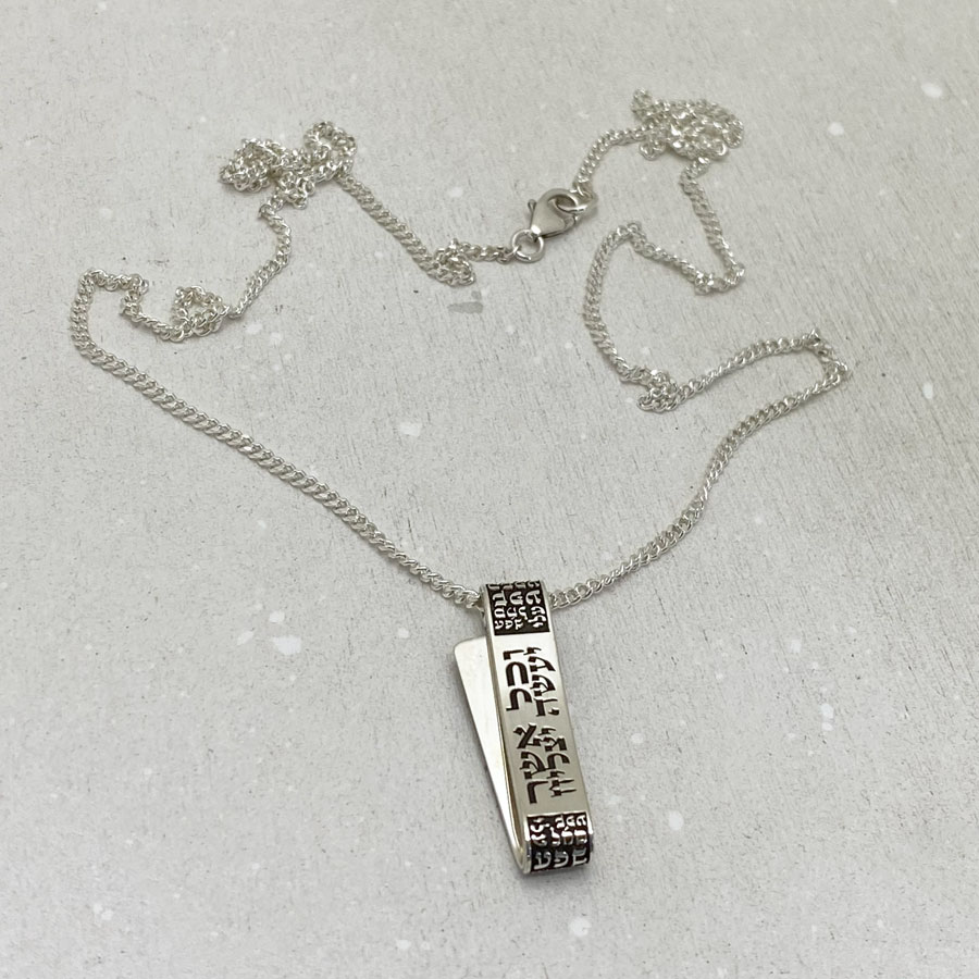 The design features a rectangular bar engraved in Hebrew with a sacred blessing for protection and prosperity: