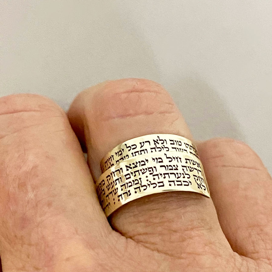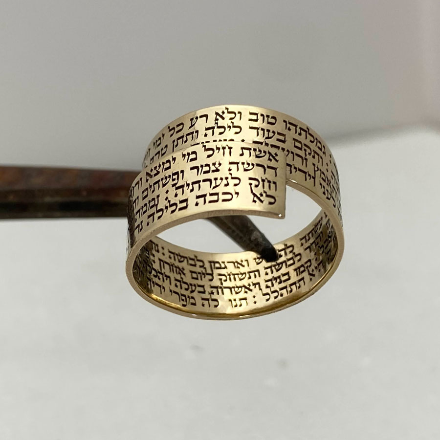 A timeless symbol of everlasting love and devotion, the Woman of Valor psalm is elegantly engraved on this gold statement ring.