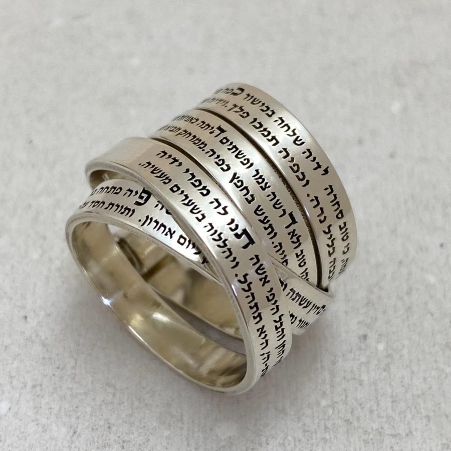 Crafted with attention to detail, this exquisite ring features a Hebrew engraving of the Jewish Psalm, Woman of Valor (Eshet Chayil).