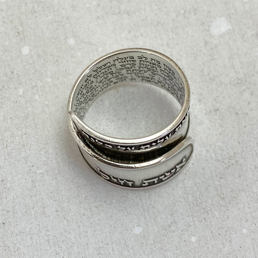 This elegant silver ring is a tribute to the timeless Jewish psalm Woman of Valor in Hebrew script.